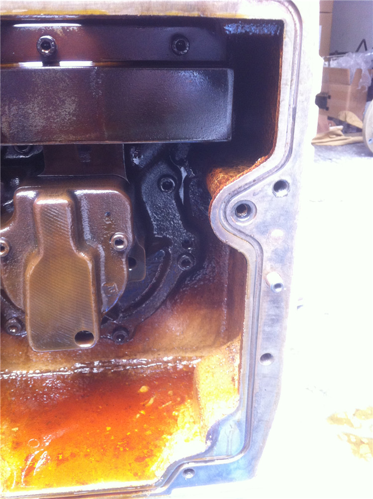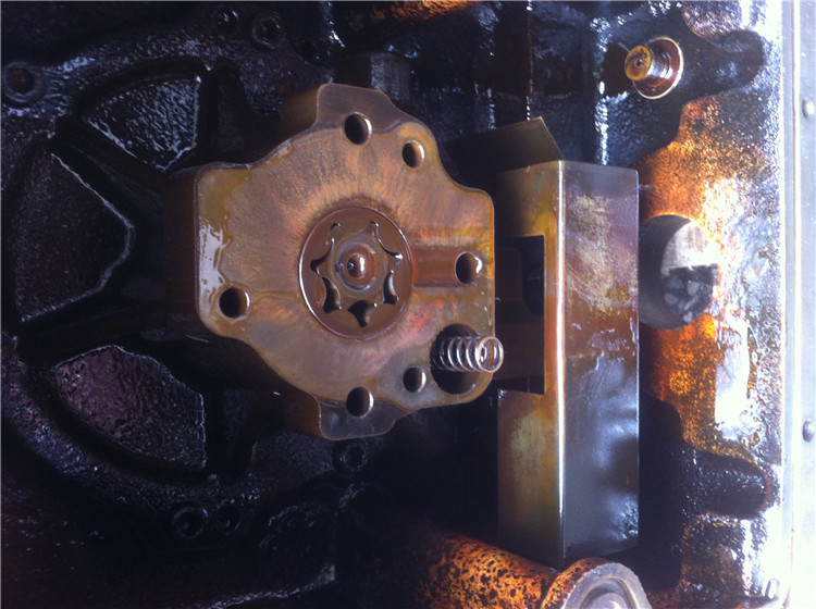 泵腔内部积满了发黑浑浊的变质泵油,油泥与积碳牢牢附着在泵壳内壁、转子表面;